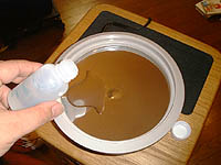 本機を使用するに当たっては、専用クリーニング液を作成する必要がある。まず、本機の蓋を開け、発振器である金属板の上に付属の洗剤を入れる。量は約10cc、キャップ3杯分だ。その後上から水を入れて洗剤を薄める、これは普通の水道水で構わないらしい。洗剤と水の量の比率は9:1、ちなみに一般の中性洗剤を代用すると、ディスクにダメージを与える可能性があるので注意。
